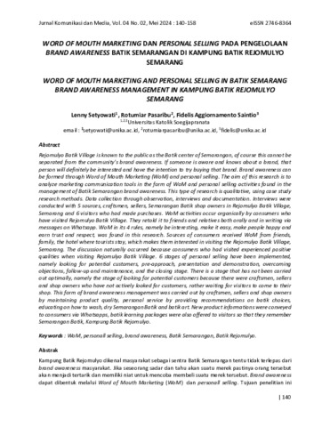 Setyowati, Lenny (2024) WORD OF MOUTH MARKETING DAN PERSONAL SELLING PADA PENGELOLAAN BRAND AWARENESS BATIK SEMARANGAN DI KAMPUNG BATIK REJOMULYO SEMARANG. Jurnal Komunikasi dan Media, 4 (2). pp. 140-158. ISSN 2746-8364