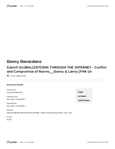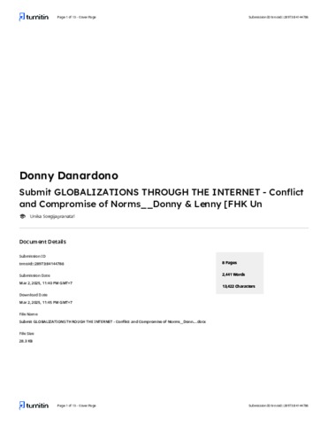 Turnitin Submit GLOBALIZATIONS THROUGH THE INTERNET - Conflict and Compromise of Norms__Donny & Lenny [FHK Unika Soegijapranata].pdf Download (234kB) | Preview |