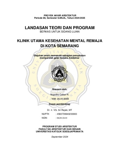 CAHYO N., NUGROHO (2024) KLINIK UTAMA KESEHATAN MENTAL REMAJA DI KOTA SEMARANG. Other thesis, UNIVERSITAS KATOLIK SOEGIJAPRANATA.