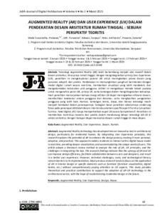 Teknologi Augmented Reality (AR) telah berkembang menjadi alat inovatif dalam desain arsitektur, khususnya rumah tinggal. Dengan mengintegrasikan prinsip User Experience (UX), penelitian ini mengeksplorasi potensi AR untuk meningkatkan proses desain yang personal, adaptif, dan praktis. Pendekatan ini memungkinkan penghuni berinteraksi dengan model digital rumah secara real-time, memberikan visualisasi yang lebih mendalam, dan mengakomodasi kebutuhan unik pengguna. Artikel ini mengadopsi metode telaah pustaka untuk menganalisis peran AR, prinsip UX, serta tantangan dalam mengintegrasikan keduanya. Hasil penelitian menunjukkan bahwa sinergi AR dan UX dapat meningkatkan efisiensi desain, memfasilitasi kolaborasi antara pengguna dan desainer, serta menghasilkan pengalaman pengguna yang lebih baik. Namun, tantangan teknis, biaya, dan literasi teknologi masih menjadi hambatan dalam penerapannya. Sebagian besar penelitian sebelumnya cenderung fokus pada penerapan AR dalam desain interior atau elemen spesifik seperti furnitur (visualisasi furnitur, hotel digital, dll.) tanpa memperhatikan aspek UX secara komprehensif. Penelitian ini memberikan kontribusi teoretis dan praktis dalam mendukung adopsi teknologi AR-UX di sektor arsitektur, dengan harapan dapat merevolusi desain rumah tinggal di masa depan.