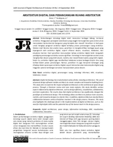 Perkembangan teknologi digital telah merevolusi berbagai bidang, termasuk arsitektur. Penggunaan perangkat lunak desain yang canggih memungkinkan para arsitek untuk menciptakan bentuk-bentuk bangunan yang kompleks dan inovatif. Penelitian ini bertujuan untuk mengkaji pengaruh arsitektur digital terhadap proses perancangan ruang arsitektur. Melalui studi literatur dan analisis kasus, penelitian ini mengidentifikasi berbagai aspek yang dipengaruhi oleh arsitektur digital, seperti efisiensi desain, visualisasi, kolaborasi, dan eksplorasi bentuk. Hasil penelitian menunjukkan bahwa arsitektur digital telah mengubah paradigma perancangan arsitektur secara signifikan. Teknologi ini memungkinkan arsitek untuk menghasilkan desain yang lebih akurat, realistis, dan inovatif dalam waktu yang lebih singkat. Selain itu, arsitektur digital juga memfasilitasi kolaborasi antara berbagai disiplin ilmu yang terlibat dalam proses perancangan. Namun, penelitian ini juga menyoroti tantangan yang dihadapi dalam penerapan arsitektur digital, seperti kebutuhan akan keterampilan digital yang tinggi dan potensi kehilangan sentuhan manusia dalam proses desain.