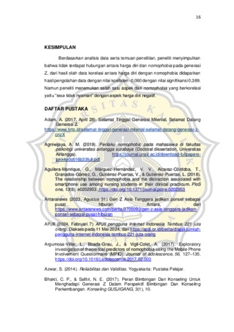 Nomophobia merupakan perasaan cemas terus-menerus yang dialami individu ketika jauh dengan smartphone, kehabisan baterai, tidak mendapatkan sinyal, teks dan/ atau notifikasi email sehingga menyebabkan rasa cemas dan/atau takut yang berlebihan. Hipotesis dari penelitian ini adalah adanya hubungan negatif antara harga diri dengan nomophobia. Metode yang digunakan merupakan kuantitatif dengan pendekatan korelasional dengan subjek Generasi Z (kelahiran 19972012) berjumlah 211 responden. Alat ukur yang digunakan skala nomophobia dan skala harga diri. Berdasarkan analisis menggunakan pearson product moment, tidak adanya hubungan antara harga diri dengan nomophobia dengan koefisien korelasi -0,060 dan nilai signifikansi 0,389 (p > 0,05).