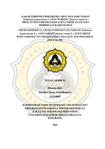 AWANTIKAPUTRI, AURELIA CHRISTA (2025) KARAKTERISTIK FISIKOKIMIA MINUMAN SARI TOMAT (Solanum lycopersicum L.) DAN WORTEL (Daucus carota L.) DENGAN PENAMBAHAN KOLAGEN CEKER AYAM DAN PERBEDAAN RASIO BAHAN. S1 thesis, UNIVERSITAS KATOLIK SOEGIJAPRANATA.