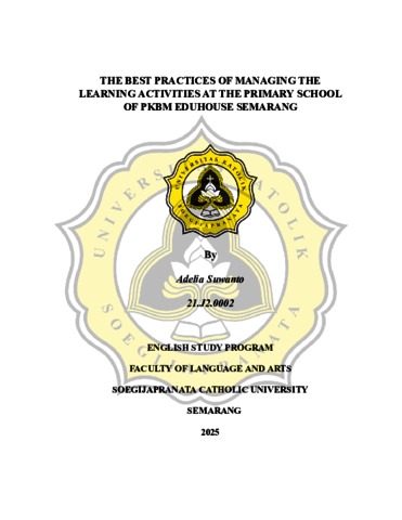 SUWANTO, ADELIA (2025) THE BEST PRACTICES OF MANAGING THE LEARNING ACTIVITIES AT THE PRIMARY SCHOOL OF PKBM EDUHOUSE SEMARANG. S1 thesis, UNIVERSITAS KATOLIK SOEGIJAPRANATA.