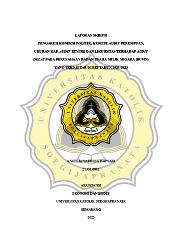 HAPSARI, ANGELIA SADELLA (2025) PENGARUH KONEKSI POLITIK, KOMITE AUDIT PEREMPUAN, UKURAN KAP, AUDIT TENURE DAN LIKUIDITAS TERHADAP AUDIT DELAY PADA PERUSAHAAN BADAN USAHA MILIK NEGARA (BUMN) YANG TERDAFTAR DI BEI TAHUN 2021-2023. S1 thesis, UNIVERSITAS KATOLIK SOEGIJAPRANATA SEMARANG.