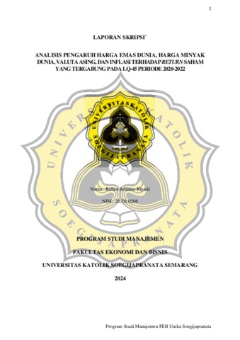 RIYADI, RUBEN JULIANUS (2024) ANALISIS PENGARUH HARGA EMAS DUNIA, HARGA MINYAK DUNIA, VALUTA ASING, DAN INFLASI TERHADAP RETURN SAHAM YANG TERGABUNG PADA LQ-45 PERIODE 2020-2022. S1 thesis, UNIVERSITAS KATOLIK SOEGIJAPRANATA.
