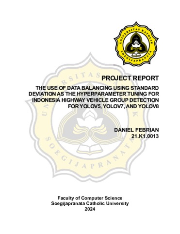 FEBRIAN, DANIEL (2024) THE USE OF DATA BALANCING USING STANDARD DEVIATION AS THE HYPERPARAMETER TUNING FOR INDONESIA HIGHWAY VEHICLE GROUP DETECTION FOR YOLOV5, YOLOV7, AND YOLOV8. S1 thesis, UNIVERSITAS KATOLIK SOEGIJAPRANATA.
