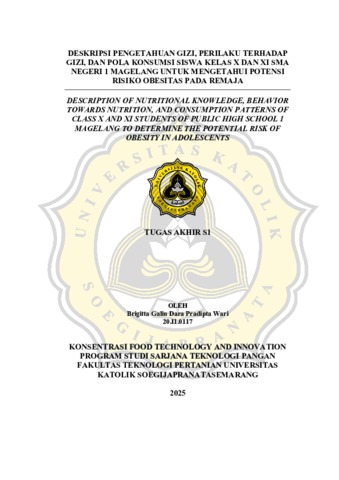 WARI, BRIGITTA GALIN DARA PRADIPTA (2025) DESKRIPSI PENGETAHUAN GIZI, PERILAKU TERHADAP GIZI, DAN POLA KONSUMSI SISWA KELAS X DAN XI SMA NEGERI 1 MAGELANG UNTUK MENGETAHUI POTENSI RISIKO OBESITAS PADA REMAJA. S1 thesis, UNIVERSITAS KATOLIK SOEGIJAPRANATA SEMARANG.