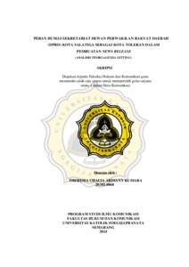 KUMARA, THERESIA CHALIA ARDIANY (2024) PERAN HUMAS SEKRETARIAT DEWAN PERWAKILAN RAKYAT DAERAH (DPRD) KOTA SALATIGA SEBAGAI KOTA TOLERAN DALAM PEMBUATAN NEWS RELEASE (ANALISIS TEORI AGENDA SETTING). S1 thesis, UNIVERSITAS KATOLIK SOEGIJAPRANATA.