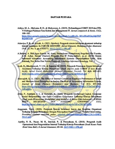 Penelitian skripsi bertujuan guna menilai pengaruh pengendalian internal, penerapan sistem informasi akuntansi dan tata kelola perusahaan atas kinerja perusahaan furniture di jepara. Penelitian ini menggarisbawahi pentingnya suatu strategi manajemen untuk mencapai tujuan perusahaan dan dapat memperbaiki kinerja melalui pengelolaan sumber daya secara optimal. Dengan cara menggunakan teori keagenan dan Technology Acception Model (TAM), penelitian mengeksplorasi bagaimana sistem informasi akuntansi yang andal dan pengendalian internal dinilai baik dapat meningkatkan kinerja bisnis. Penelitian ini juga menyelidiki fungsi tata kelola yang baik dalam pembentukan kepercayaan investor, memastikan transparansi serta akuntabilitas dalam operasional perusahaan. Melalui analisis terhadap perusahaan manufaktur di Jepara. Penelitian ini menggambarkan pengendalian internal tidak berdampak positif terhadap kinerja perusahaan. Sedangkan, penerapan sistem informasi akuntansi dan prinsip prinsip tata kelola perusahaan memiliki pengaruh positif yang signifikan terhadap kinerja perusahaan. Hasil penelitian diharapkan bisa menjadi kontribusi terhadap literatur akademis serta praktis bagi perusahaan untuk dapat meningkatkan kinerja melalui implementasi pengendalian internal, sistem informasi akuntansi dan tata kelola perusahaan yang efektif.