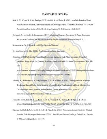 Penelitian ini menganalisis penerapan segitiga retorika visual dalam tiga video terpopuler food vlogger Nex Carlos di YouTube. Food vlogging sebagai bentuk komunikasi digital mengandalkan elemen visual dan naratif untuk menarik audiens, di mana Nex Carlos dikenal karena pendekatannya yang sederhana namun efektif dalam mengulas makanan. Dengan menggunakan metode kualitatif deskriptif dan pendekatan analisis isi, penelitian ini mengeksplorasi bagaimana elemen retorika visual berdasarkan konsep segitiga retorika Hesford dan Brueggemann diterapkan dalam video Nex Carlos. Data dikumpulkan melalui dokumentasi tiga video terpopuler dan dianalisis menggunakan konsep ethos, pathos, dan logos untuk mengidentifikasi strategi komunikasi visual yang digunakan. Hasil penelitian menunjukkan bahwa Nex Carlos memanfaatkan ekspresi wajah, gestur, sudut pengambilan gambar, serta interaksi dengan penjual untuk membangun kedekatan dengan audiens. Teknik close-up pada makanan, framing yang dinamis, serta gaya naratif yang ringan dan humoris meningkatkan daya tarik konten dan memperkuat keterlibatan penonton. Retorika visual terbukti memainkan peran penting dalam kesuksesan food vlogging. Pemahaman lebih dalam tentang strategi retorika visual dapat menjadi referensi bagi food vlogger lain dalam menciptakan konten yang menarik dan membangun audiens secara efektif.