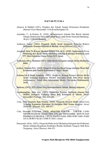 ABSTRAK Starbucks Coffee merupakan gerai kopi yang berasal dari Amerika Serikat dan telah berkembang pesat sampai memasuki pasar di Indonesia. Starbucks Coffee melakukan strategi promosi yang aktif terutama pada media sosial. Penelitian ini bertujuan untuk mengetahui strategi promosi melalui media sosial terhadap minat beli konsumen pada Starbucks Coffee Semarang. Populasi dan sampel yaitu diambil dari para konsumen sebanyak 96 responden. Teknik pengumpulan data dilakukan dengan melakukan penyebaran kuesioner menggunakan skala Likert. Penelitian ini merupakan penelitian kuantitatif, menggunakan analisis statistik deskriptif, analisis statistik inferensial regresi linear berganda, Uji T, dan Uji F. Hasil dari penelitian ini menunjukan bahwa adanya pengaruh antara strategi promosi melalui media sosial terhadap minat beli konsumen. Kata Kunci : Promosi, Media Sosial, Minat Beli Konsumen