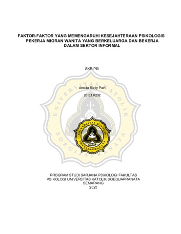 PUTRI, AMALIA RIZKY (2024) FAKTOR-FAKTOR YANG MEMENGARUHI KESEJAHTERAAN PSIKOLOGIS PEKERJA MIGRAN WANITA YANG BERKELUARGA DAN BEKERJA DALAM SEKTOR INFORMAL. S1 thesis, UNIVERSITAS KATOLIK SOEGIJAPRANATA.