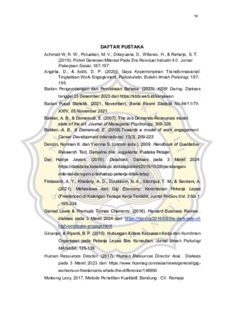 Berkembangnya industri 4.0 membuat bidang ketenagakerjaan semakin efektif. Pekerjaan semakin bervariatif seperti konsultan, content creator, dan sebagai nya. Fenomena ini menyebabkan individu mulai memiliki beberapa pekerjaan dalam satu waktu atau dikenal sebagai pekerja lepas. Pekerja lepas saat ini di dominasi oleh generasi milenial. Generasi milenial memiliki kebutuhan aktualisasi yang tinggi, kreatif, dan menyukai tantangan. Di sisi lain, generasi milenial cenderung mudah bosan dan memiliki loyalitas yang rendah. Sedangkan, perusahaan membutuhkan karyawan yang dapat memberikan performa kerja yang baik. Hal tersebut muncul pada karyawan yang memiliki keterikatan yang tinggi terhadap pekerjaan dan perusahaan. Penelitian ini bertujuan untuk memahami dinamika keterikatan kerja pada pekerja lepas di sebuah lembaga pengembangan SDM bernama Optimus Training Center. Penelitian ini merupakan penelitian kualitatif, dengan pengambilan data melalui wawancara 2 responden. Hasil temuan ini menunjukkan bahwa dua responden yang merupakan pekerja lepas di Optimus Training Center memiliki keterikatan kerja yang tinggi. Ditemukan adanya faktor dan beberapa perilaku yang menandakan seseorang memiliki keterikatan kerja yang tinggi.