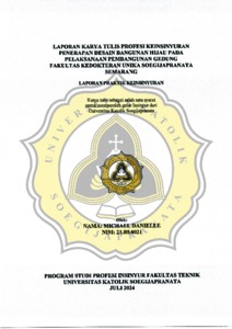DANIELLE, MICHAEL (2024) PENERAPAN DESAIN BANGUNAN HIJAU PADA PELAKSANAAN PEMBANGUNAN GEDUNG FAKULTAS KEDOKTERAN UNIKA SOEGIJAPRANATA SEMARANG. Project Report. UNIVERSITAS KATOLIK SOEGIJAPRANATA, SEMARANG. (Unpublished)