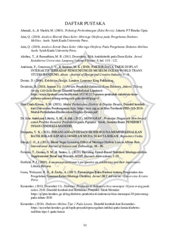 Diabetes merupakan salah satu penyakit tidak menular yang prevalensinya terus meningkat di seluruh dunia, termasuk di Indonesia. Pencegahan dan pengelolaan diabetes memerlukan pendekatan yang komprehensif, termasuk edukasi mengenai manfaat alami seperti daun kelor (Moringa oleifera) dalam menurunkan kadar gula darah. Daun kelor dikenal memiliki kandungan nutrisi yang tinggi dan senyawa aktif yang dapat membantu menurunkan kadar gula darah, menjadikannya sebagai alternatif alami untuk pencegahan diabetes. Penelitian ini bertujuan untuk merancang komunikasi visual berupa eksibisi interaktif yang efektif dan menarik dalam menyampaikan informasi mengenai khasiat ekstrak daun kelor dalam menurunkan kadar gula darah, serta meningkatkan kesadaran masyarakat akan pentingnya pencegahan diabetes Kata Kunci : DKV, Eksibisi, Interaktif, Daun Kelor, Kadar Gula Darah, Diabetes