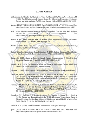 Perancangan ini dilakukan dengan tujuan untuk menjadi alat intervensi mengatasi peningkatan jumlah depresi pada remaja, dengan menawarkan solusi kreatif yang murah dan mudah diakses. Pada tahun 2022, kesehatan mental yang memburuk dapat menyebabkan kesulitan dalam regulasi emosi dan mengakibatkan masalah emosional, perilaku, dan sosial. Dengan regulasi emosi dan kesehatan mental yang memburuk, remaja dapat mengalami depresi dan melakukan self-injury. Perancangan visual game ini menggunakan metode ADDIE yang bersifat gamifikasi dengan mempertimbangkan prinsip dan teori Desain Komunikasi Visual (DKV), serta datadata dari jurnal dan umpan balik pengguna. Elemen visual diterima dengan baik oleh pengguna dan menunjukkan potensi penggunaan game sebagai alat intervensi masalah kesehatan mental yang mudah diakses. Kata kunci: Intervensi Kesehatan Mental, Depresi Remaja, Regulasi Emosi, Gamifikasi, ADDIE