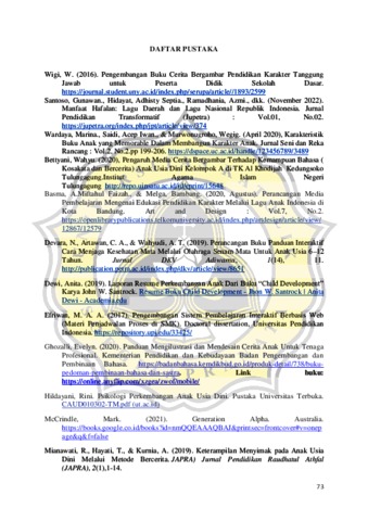 Generasi penerus bangsa yang salah satunya kini berada di bangku sekolah dasar merupakan generasi yang dekat dan tumbuh berdampingan dengan keberadaan teknologi. Keberadaan teknologi tersebut apabila tidak tersaring dengan baik menyebabkan dampak yang negatif salah satunya yakni banyaknya generasi saat ini (generasi alpha) yang tidak mengenal atau melupakan keberadaan lagu daerah sebagai bentuk dari warisan kebudayaan Indonesia. Ditemukan sebanyak 66,7% mengakui bahwa anak lebih menyukai lagu modern dan lagu internasional dibandingkan dengan lagu daerah. Dari permasalahan yang dipaparkan tersebut, maka diperlukan adanya perancangan sebagai media belajar sekaligus upaya dalam melestarikan wawasan kebudayaan Indonesia dan nilai yang diangkat melalui lagu daerah kepada generasi penerus. Tujuan dari perancangan ini adalah merancang buku interaktif anak yang menerapkan metode cerita visual storytelling dikemas dengan alur cerita lagu daerah yang diangkat. Lagu daerah yang diangkat dapat mewakilkan pengetahuan arti makna lagu dan juga pesan moral yang didapatkan. Metode analisis data menggunakan 5W+1H dan analisis SWOT sebagai konsep merancang buku interaktif. Hasil dari perancangan ini menggabungkan antara buku cerita visual dongeng anak berbentuk fisik dan kegiatan interaktif yakni audio yang dapat diakses menggunakan qr-code, dan kegiatan tempel menempel sesuai dengan petunjuk dan imajinasi anak. Perancangan buku interaktif ini diharapkan dapat memberikan sumbangan karya dalam ranah desain komunikasi visual sehingga dapat dipergunakan sebagai media pembelajaran untuk memperkenalkan nilai moral yang didapatkan dan wawasan lagu daerah yang mulai terlupakan di generasi penerus bangsa. Kata kunci : Buku interaktif, anak generasi alpha, lagu daerah