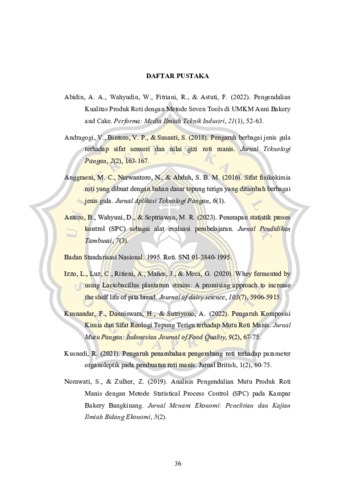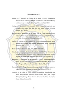 Semakin berkembangnya bisnis yang semakin ketat membuat para pelaku bisnis berlomba-lomba memenangkan persaingan dengan meningkatkan kualitas dari produk yang dijual. Salah satu pelaku bisnis yang terus meningkatkan kualitas yaitu produsen roti. Roti manis merupakan roti yang ditambahkan gula dalam jumlah besar pada saat pengolahannya. Gula berperan penting dalam produksi roti dengan memberikan rasa, mengatur fermentasi, memperpanjang umur simpan roti, meningkatkan nilai gizi, melunakkan tekstur roti, menambah kelembaban pada roti, sebagai makanan ragi, dan memberikan warna coklat pada roti. Penelitian ini bertujuan untuk mengetahui pengendalian mutu produk roti manis dengan menggunakan metode Statistical Process Control (SPC) di Dyriana Bakery Semarang. Metode yang digunakan pada penelitian ini ialah menggunakan check sheet dengan mengelompokkan data berdasarkan jenis kerusakan yang terjadi, kemudian data jenis kerusakan yang telah dikelompokkan akan diolah ke dalam histogram untuk melihat jenis kecacatan mana yang paling tinggi. Setelah itu data yang sudah diolah akan di analisis kembali dengan menggunakan peta kendali untuk melihat kecacatan yang terjadi masih dalam batas kendali atau sudah melewati batas kendali. Kemudian, dari hasil tersebut data di analisis dengan menggunakan diagram sebab-akibat (fishbone diagram) untuk melihat faktor penyebab dari roti manis yang mengalami kecacatan. Lalu data jenis kerusakan yang telah dikelompokkan akan disajikan kedalam diagram pareto untuk memperjelas jenis kecacatan yang paling tinggi yang nantinya akan jadi prioritas untuk diperbaiki. Hasil penelitian ini menunjukkan bahwa penggunaan SPC dapat membantu dalam mendeteksi penyimpangan dari spesifikasi yang ditetapkan, sehingga memungkinkan tindakan korektif yang cepat dan tepat. Hasil dari penyimpangan yang didapatkan di Dyriana Bakery pada produk roti manis sebanyak 134 pcs roti yang terbagi kedalam cacat hangus sebesar 60 pcs, kemudian jenis cacat roti tidak sesuai dengan ukurannya sebanyak 74 pcs. Ratarata dari kerusakan yang terjadi pada roti manis sebesar 16.71. Hasil analisa data kerusakan roti manis dengan menggunakan peta kendali didapatkan bahwa garis pusat (CL) tingkat kerusakan pada produk roti manis di Dyriana Bakery berada pada titik 0.008375 dengan garis kendali atas (UCL) 0.008133626, sedangkan garis batas kendali bawah (LCL) berada pada titik 0.007866374. Hasil ini menunjukkan bahwa tingkat kerusakan yang terjadi pada produk roti manis di Dyriana Bakery masih terkendali, namun tetap perlu dilakukan adanya perbaikan dan kontrol agar semakin meminimalisir kerusakan. Kata kunci: roti manis, Statistical Process Control