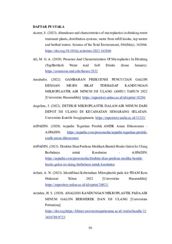 Permasalahan mikroplastik sudah menjadi permasalahan yang dihadapi semua negara di seluruh dunia. Karakteristik mikroplastik yang berukuran kecil, tidak mudah rusak dan terdegradasi, menjadikan partikel ini dapat ditemukan dimana-mana. Sebelumnya, air laut, bivalva, ikan air laut, dan sebagainya merupakan objek utama penelitian keberadaan mikroplastik karena jumlah sampah plastik yang terakumulasi di laut. Saat ini, partikel mikroplastik juga dapat ditemukan di udara, dan produk pangan seperti madu, gula, susu, dan tidak terkecuali air minum. Mikroplastik dalam air minum dapat bersumber dari sumber air baku yang tercemar, alat produksi air minum, wadah atau pengemas, hingga perlakuan-perlakuan tertentu pada saat proses distribusi dan konsumsi. Rangkaian proses produksi air minum memegang peranan penting pada keberadaan mikroplastik dalam air minum yang dikonsumsi sehari-hari. Tujuan penelitian ini ialah untuk menentukan tingkat cemaran mikroplastik dan karakternya serta menentukan titik tahapan produksi yang berpotensi menjadi sumber masuknya mikroplastik pada AMIU Uniqua. Sampel air Uniqua diambil pada setiap titik produksi AMIU sebanyak 2 liter dengan 3 kali pengulangan. Sampel air pada galon lama dan baru turut diambil dengan jumlah pengulangan yang sama. Pengolahan sampel dilakukan dengan menyaring air melewati membran PTFE Omnipore menggunakan pompa vakum. Membran PTFE yang terduga mengandung mikroplastik diamati menggunakan mikroskop untuk karakterisasi bentuk, warna, ukuran, dan jumlah, dan dilanjutkan oleh µ-FTIR untuk karakterisasi jenis polimer. Data temuan karakteristik mikroplastik diolah secara deskriptif dan disajikan dalam bentuk grafik dan tabel. PSM berukuran <50 µm merupakan yang paling dominan dari seluruh partikel yang ditemukan. Fragmen (69,18%) merupakan bentuk PSM yang paling banyak ditemukan diikuti oleh lembaran dan serat. Warna dominan PSM pada sampel air minum Uniqua ialah transparan (35,2%) dan coklat/merah (34,04%). PA/Nilon (27,38%) diikuti oleh PVC dan PET merupakan jenis polimer mikroplastik yang paling banyak ditemukan pada seluruh sampel air. Kontaminasi mikroplastik paling tinggi ditemukan pada sampel dari tandon penampungan plastik selama treatment sedimentasi (420,89 partikel/L). Tingginya komposisi polimer PE (31,44%) menunjukkan adanya migrasi mikroplastik dari plastik tandon ke dalam air. Titik Kendali Kritis (TKK) mikroplastik dalam rangkaian produksi AMIU Uniqua yaitu pada proses penyaringan RO tahap kedua dan proses pencucian galon bagian dalam.