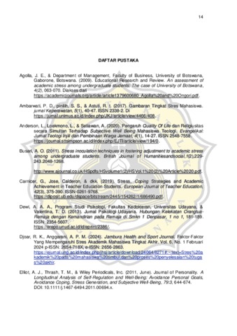 Abstrak Menjadi mahasiswa merupakan proses pendewasaan dan banyaknya berbagai masalah yang harus dihadapi terkhusus mahasiswa yang masuk di Teologi. Tuntutan sebagai mahasiswa Teologi yang berlebihan dapat menyebabkan timbulnya stres akademik pada mahasiswa Teologi. Mahasiswa yang mengalami stres akan berusaha untuk menyelesaikan masalah yang dihadapi. Hal ini menunjukan bahwa mahasiswa memerlukan coping khususnya Problem Focused Coping dalam menyelesaikan masalah yang terjadi di akademik. Tujuan penelitian ini untuk mengetahui apakah ada hubungan antara Problem Focused Coping dengan Stres Akademik pada Mahasiswa Sekolah Tinggi Teologi ”X” di Ungaran. Hipotesis yang digunakan dalam penelitian ini adalah “Ada hubungan yang negatif antara Problem Focused Coping dengan Stres Akademik pada mahasiswa Sekolah Tinggi Teologi ”X” di Ungaran”. Penelitian ini menggunakan pendekatan kuantitatif korelasional. Populasi penelitian dengan karakteristik usia 17-26 tahun. Jumlah responden yang diperoleh 59 responden. Pengumpulan data dilakukan secara online dengan menyebarkan skala Stres Akademik dan Problem Focused Coping. Hasil penelitian menunjukan hasil korelasi sebesar r= -0.573 dengan nilai signifikansi (p) sebesar 0.000 (p<0,01). Hasil analisis membuktikan ada hubungan negatif yang sangat signifikan antara variabel Problem Focused Coping dan variabel Stres Akademik maka semakin tinggi Problem Focused Coping yang dilakukan oleh mahasiswa Teologi maka akan semakin rendah stres yang akan dihadapi selama berkuliah di Sekolah Teologi dan sebaliknya dengan sumbangan variabel Problem Focused Coping sebesar 32,8%. Kata kunci: Problem Focused Coping, Stres akademik, Mahasiswa.