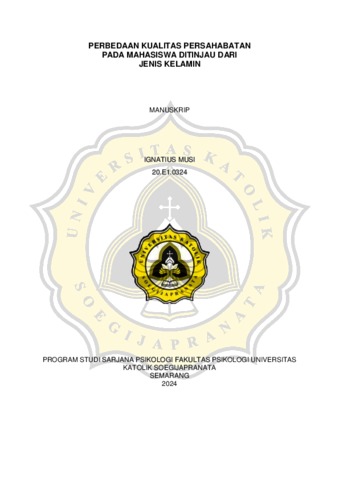MUSI, IGNATIUS (2024) PERBEDAAN KUALITAS PERSAHABATAN PADA MAHASISWA DITINJAU DARI JENIS KELAMIN. S1 thesis, UNIVERSITAS KATOLIK SOEGIJAPRANATA.