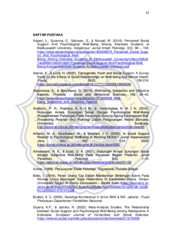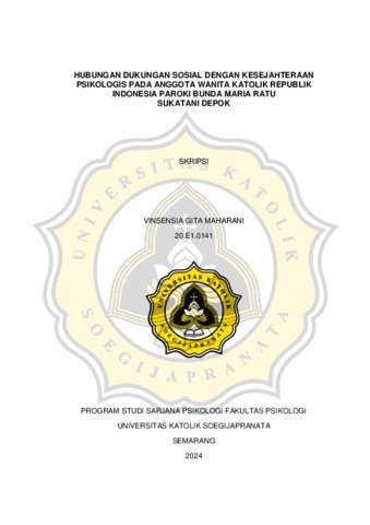 MAHARANI, VINSENSIA GITA (2024) HUBUNGAN DUKUNGAN SOSIAL DENGAN KESEJAHTERAAN PSIKOLOGIS PADA ANGGOTA WANITA KATOLIK REPUBLIK INDONESIA PAROKI BUNDA MARIA RATU SUKATANI DEPOK. S1 thesis, UNIVERSITAS KATOLIK SOEGIJAPRANATA.