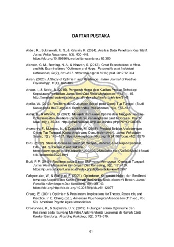 ABSTRAK Penelitian ini dilakukan untuk menguji secara empiris apakah ada hubungan positif antara Optimisme dan Resiliensi pada Remaja dengan Orang Tua Tunggal (Single Parent). Hipotesis dari penelitian ini adalah jika nilai Optimisme tinggi, maka ada kemungkinan bahwa Remaja bisa bangkit dari keterpurukan (Resiliensi). Populasi penelitian ini berfokus pada Remaja berusia 13-15 tahun yang tinggal dan/atau memiliki orang tua tunggal serta tinggal di Provinsi Jawa Tengah. Dari populasi tersebut, 71 Remaja bersedia menjadi responden. Metode yang dipakai dalam penelitian ini adalah metode kuantitatif korelasional nonparametrik dengan Spearman’s Rho, serta menggunakan skala adaptasi LOT-R untuk Optimisme dan CD-RISC untuk Resiliensi. Hasil penelitian menunjukkan bahwa Optimisme tidak memunculkan angka sementara Resiliensi menujukkan angka koefisien korelasi sebesar 0. 16 dan nilai Signifikansi 0. 19, sehingga hipotesis penelitian ditolak. Budaya masyarakat, luasnya cakupan topik orang tua tunggal, serta jumlah pernyataan yang sedikit dari skala LOT-R menjadi 3 penyebab hipotesis ditolak. Kata kunci : Optimisme, Resiliensi, Remaja