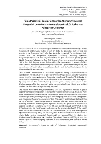 SARWO, YOHANES BUDI and Anggraini, Charunia and Sulistyanto, Hadi Peran Puskesmas Dalam Pelaksanaan Skrinning Hipotiroid Kongenital Untuk Menjamin Kesehatan Anak Di Puskesmas Kabupaten Oku Timur. SOEPRA Jurnal Hukum Kesehatan. ISSN 2548-818X (media online)