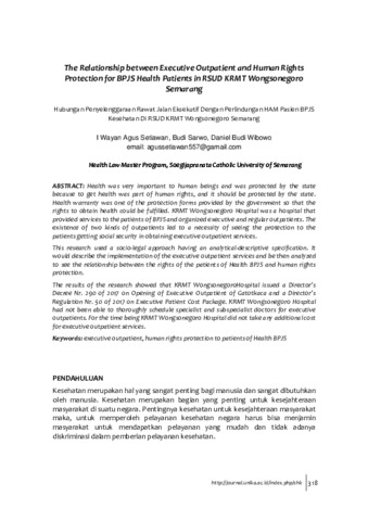 SARWO, YOHANES BUDI and Setiawan, I Wayan Agus and Wibowo, Daniel Budi The Relationship between Executive Outpatient and Human Rights Protection for BPJS Health Patients in RSUD KRMT Wongsonegoro Semarang. SOEPRA Jurnal Hukum Kesehatan. ISSN 2548-818X (media online)