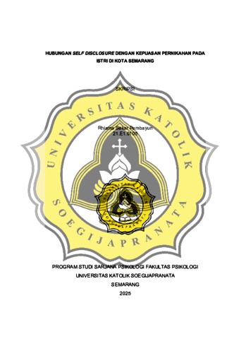 PAMBAYUN, RHISMA SEKAR (2025) HUBUNGAN SELF DISCLOSURE DENGAN KEPUASAN PERNIKAHAN PADA ISTRI DI KOTA SEMARANG. S1 thesis, UNIVERSITAS KATOLIK SOEGIJAPRANATA.