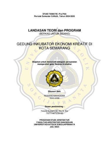MAHADEWA, RICHARD (2025) GEDUNG INKUBATOR EKONOMI KREATIF DI KOTA SEMARANG. S1 thesis, UNIVERSITAS KATOLIK SOEGIJAPRANATA SEMARANG.