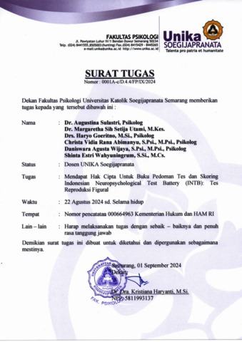 SULASTRI, AUGUSTINA and Utami, Margaretha Sih Setija and GOERITNO, HARYO and ABIMANYU, CHRISTA VIDIA RANA and WIJAYA, DANISWARA AGUSTA and Wahyuningrum, Shinta Estri HKI : Buku Pedoman Tes Dan Skoring Indonesian Neuropsychological Test Battery (INTB): Tes Reproduksi Figural. LPPM Universitas Katolik Soegijapranata.