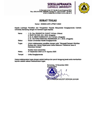Dukut, Ekawati Marhaenny and ELYADI, RUDY and NURHAYATI, BERNADETA RESTI and ANANINGSIH, VICTORIA KRISTINA Menggali Dampak Hibriditas Budaya dan Literasi Digital pada Usaha Makanan Tradisional Jawa di Kelurahan Kemijen. Project Report. Universitas Katolik Soegijapranata, Semarang.