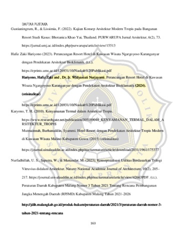 Perancangan resort di Wagir, Malang ini mengusung konsep arsitektur tropis sebagai pendekatan utama dalam menciptakan ruang yang adaptif terhadap kondisi iklim setempat. Lokasi perancangan yang berada di Kawasan lerengan dengan potensi alam yang kaya memberikan peluang bessar untuk menerapkan prinsio-prinsip desain tropis seperti orientasi bangunan yang memperhatikan arah matahari dan angin, penggunaan material alami, serta pencahayaan dan ventilasi alami. Resort ini dirancang untuk menghadirkan kenyamanan termal, efisiensi energi, dan kesan menyatu dengan lingkungan dengan tetap mempertimbangkan aspek estetika dan fungsional. Hasil perancangan diharapkan tidak hanya menciptakan ruang akomodasi yang nyaman, tetapi juga memberikan pengalaman tinggal yang harmonis dengan alam bagi para pengunjung.