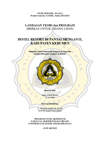HAMID, ILHAM ABDUL (2025) HOTEL RESORT DI PANTAI MENGANTI, KABUPATEN KEBUMEN. S1 thesis, UNIVERSITAS KATOLIK SOEGIJAPRANATA.