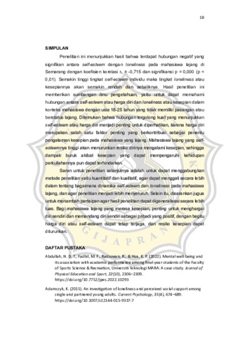 Kesepian merupakan masalah psikologis yang umum dialami oleh mahasiswa lajang, terutama di masa transisi menuju kedewasaan. Penelitian ini bertujuan untuk mengetahui hubungan antara self-esteem dengan loneliness pada mahasiswa lajang di Semarang. Pendekatan kuantitatif korelasional digunakan dalam penelitian ini, dengan jumlah partisipan sebanyak 117 mahasiswa berusia 18–25 tahun yang berstatus lajang. Instrumen yang digunakan adalah De Jong Gierveld Loneliness Scale dan skala self-esteem yang dikembangkan berdasarkan teori Heatherton & Wyland (2003). Analisis data dilakukan menggunakan teknik non-parametrik Spearman’s rho karena data tidak berdistribusi normal. Hasil analisis menunjukkan adanya hubungan negatif yang signifikan antara self-esteem dan loneliness dengan nilai rs = -0,715 dan p < 0,01. Artinya, semakin tinggi tingkat self-esteem seseorang, maka semakin rendah tingkat kesepian yang dirasakan, dan sebaliknya. Temuan ini menunjukkan bahwa self-esteem memainkan peran penting dalam mengurangi rasa kesepian pada mahasiswa lajang, sehingga intervensi yang meningkatkan self-esteem berpotensi menurunkan resiko loneliness. Kata kunci: Dewasa awal, kesepian, self-esteem