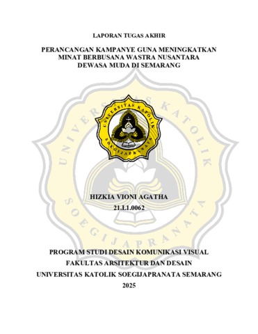 AGATHA, HIZKIA VIONI (2025) PERANCANGAN KAMPANYE GUNA MENINGKATKAN MINAT BERBUSANA WASTRA NUSANTARA DEWASA MUDA DI SEMARANG. S1 thesis, UNIVERSITAS KATOLIK SOEGIJAPRANATA.