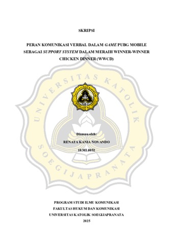 OVANDO, RENATA KANIA (2025) PERAN KOMUNIKASI VERBAL DALAM GAME PUBG MOBILE SEBAGAI SUPPORT SYSTEM DALAM MERAIH WINNER-WINNER CHICKEN DINNER (WWCD). S1 thesis, UNIVERSITAS KATOLIK SOEGIJAPRANATA.