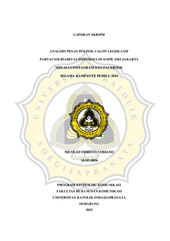 YOSIANO, NICOLAS CHRISTO (2025) ANALISIS PESAN POLITIK CALON LEGISLATIF PARTAI SOLIDARITAS INDONESIA DI DAPIL DKI JAKARTA MELALUI INSTAGRAM DAN FACEBOOK SELAMA KAMPANYE PEMILU 2024. S1 thesis, UNIVERSITAS KATOLIK SOEGIJAPRANATA.