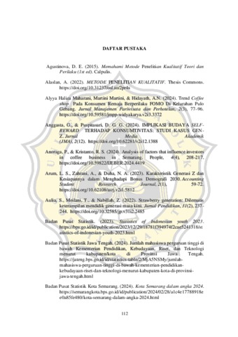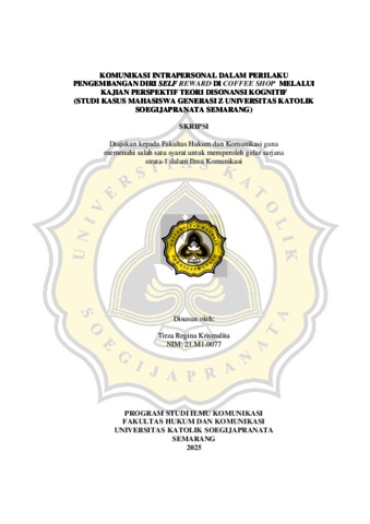 KRISMALITA, TIRZA REGINA (2025) KOMUNIKASI INTRAPERSONAL DALAM PERILAKU PENGEMBANGAN DIRI SELF REWARD DI COFFEE SHOP MELALUI KAJIAN PERSPEKTIF TEORI DISONANSI KOGNITIF (STUDI KASUS MAHASISWA GENERASI Z UNIVERSITAS KATOLIK SOEGIJAPRANATA SEMARANG). S1 thesis, UNIVERSITAS KATOLIK SOEGIJAPRANATA.