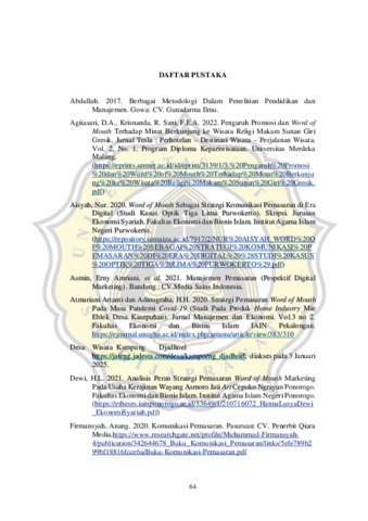 ROSE, VALENCIA (2025) PENERAPAN KOMUNIKASI PEMASARAN KAMPUNG BATIK DJADOEL MELALUI WORD OF MOUTH. S1 thesis, UNIVERSITAS KATOLIK SOEGIJAPRANATA.