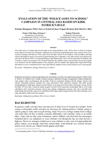 Widyorini, Endang and ABIMANYU, CHRISTA VIDIA RANA Similarity : EVALUATION OF THE "POLICE GOES TO SCHOOL" CAMPAIGN IN CENTRAL JAVA BASED ON KIRK PATRICK'S RULE. Repository Unika. (Unpublished)