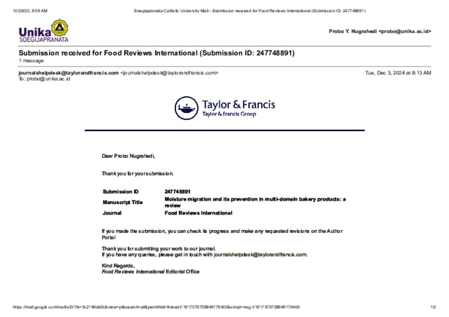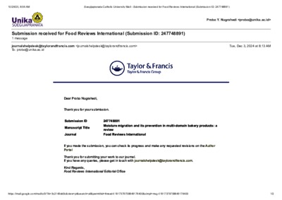 Nugrahedi, Probo Y. and Soesilo, S.A. and Perdana, J and YUDIAR, HANIEL and Sanyoto, Gelbert Jethro Moisture Migration and Its Prevention in Multi-Domain Bakery Products: A Review. TAYLOR & FRANCIS.