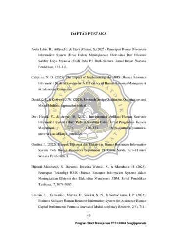 WARDHANI, FIDELIS DWI (2026) ANALISIS DESKRIPTIF PENERAPAN HUMAN RESOURCE INFORMATION SYSTEM (MyKG) DALAM PENGELOLAAN SUMBER DAYA MANUSIA PADA TOKO BUKU GRAMEDIA SEMARANG PANDANARAN. S1 thesis, UNIVERSITAS KHATOLIK SOEGIJAPRANATA.
