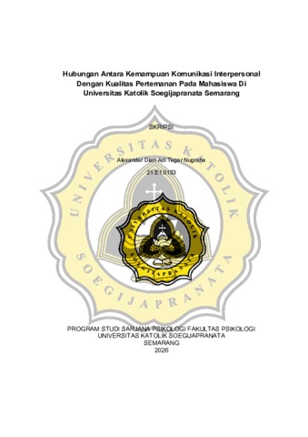 NUGRAHA, ALEXANDER DIAN ADI TEGAR (2026) HUBUNGAN ANTARA KEMAMPUAN KOMUNIKASI INTERPERSONAL DENGAN KUALITAS PERTEMANAN PADA MAHASISWA DI UNIVERSITAS KATOLIK SOEGIJAPRANATA SEMARANG. S1 thesis, UNIVERSITAS KHATOLIK SOEGIJAPRANATA.