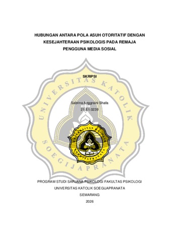 SHAFA, SABRINA ANGGRAINI (2026) HUBUNGAN ANTARA POLA ASUH OTORITATIF DENGAN KESEJAHTERAAN PSIKOLOGIS PADA REMAJA PENGGUNA MEDIA SOSIAL. S1 thesis, UNIVERSITAS KHATOLIK SOEGIJAPRANATA.