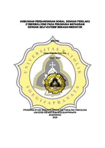 ARTA, HAWA AMEYLIA PUTRI (2026) HUBUNGAN PERBANDINGAN SOSIAL DENGAN PERILAKU CYBERBULLYING PADA PENGGUNA INSTAGRAM DENGAN SELF-ESTEEM SEBAGAI MEDIATOR. S1 thesis, UNIVERSITAS KHATOLIK SOEGIJAPRANATA.