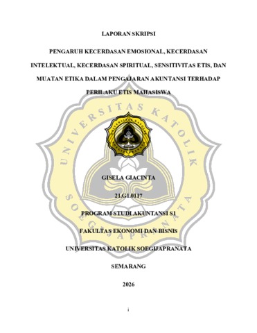 GIACINTA, GISELA (2026) PENGARUH KECERDASAN EMOSIONAL, KECERDASAN INTELEKTUAL, KECERDASAN SPIRITUAL, SENSITIVITAS ETIS, DAN MUATAN ETIKA DALAM PENGAJARAN AKUNTANSI TERHADAP PERILAKU ETIS MAHASISWA. S1 thesis, UNIVERSITAS KHATOLIK SOEGIJAPRANATA.