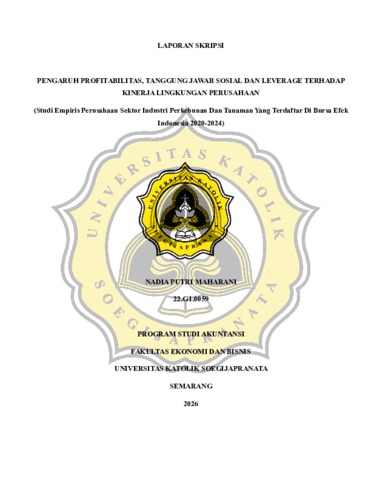 MAHARANI, NADIA PUTRI (2026) PENGARUH PROFITABILITAS, TANGGUNG JAWAB SOSIAL DAN LEVERAGE TERHADAP KINERJA LINGKUNGAN PERUSAHAAN (Studi Empiris Perusahaan Sektor Industri Perkebunan Dan Tanaman Yang Terdaftar Di Bursa Efek Indonesia 2020-2024). S1 thesis, UNIVERSITAS KHATOLIK SOEGIJAPRANATA.